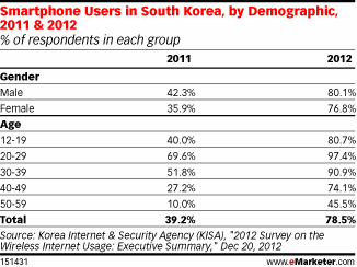 在韩国,移动互联网的市场占有率迅速增长。从韩国网络与安全局(Korea Internet & Security Agency, KISA)12月份的一份报告来看,从2011年到2012年,智能手机和平板的用户数量均翻了一番。