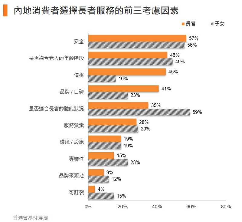 至于选择长者服务时的考虑因素,调查发现内地消费者最注重服务的安全性,分别有24%和30%受访长者和子女视安全为首要考虑。其次,消费者也格外关注该服务是否适合长者,包括对年龄阶段和体能状况方面的考虑。子女尤其注重后者,有接近六成受访子女列该因素为他们为年长父母安排使用长者服务时的前三考虑因素之一。另外,调查结果也显示,长者比子女更关注相关服务的价格,45%受访长者将价格列为前三考虑因素,比率较子女多出接近3倍。或许正因为子女对价格的关注度低,子女为父母花在长者服务的消费金额比长者自费更高。