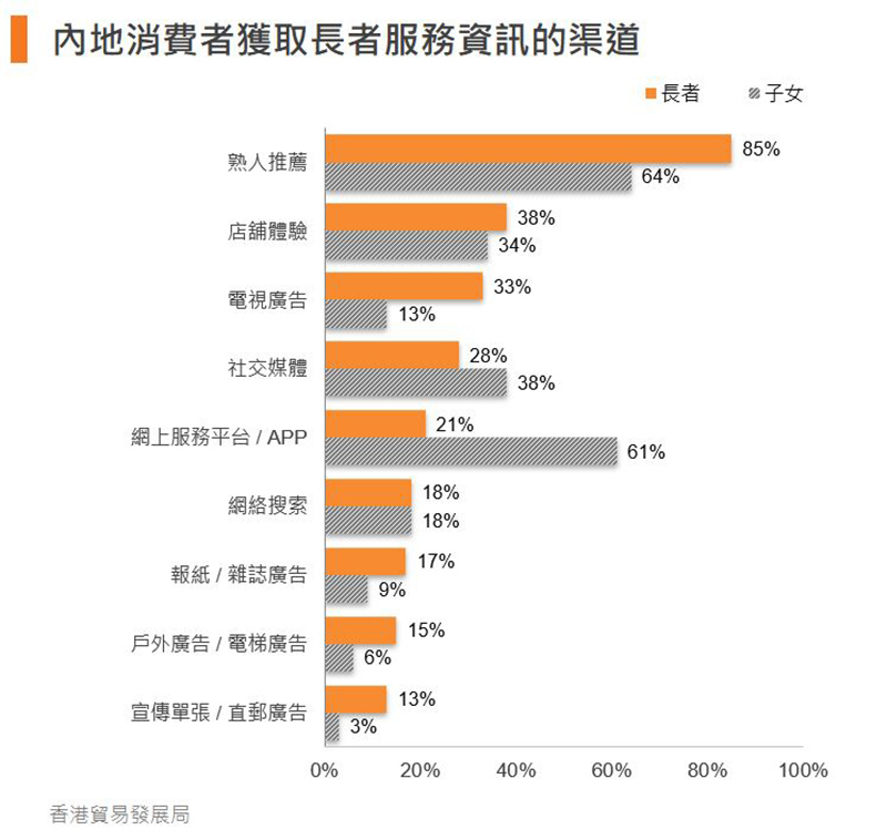 调查发现,内地消费者多透过熟人推荐获取长者服务型消费的资讯,分别有85%和64%受访长者及子女表示亲友会向他们分享消费资讯。熟人推荐同时是最影响内地消费者的渠道,61%和41%长者及子女认为,通过微信朋友群、QQ群等接收的消费资讯,对他们选择长者服务的决策最有影响力。