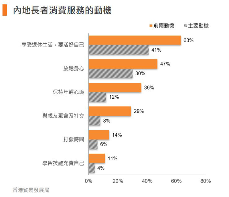 随着收入增长和身体状况改善,内地长者对服务型消费需求大增,约四成受访长者表示,享受退休生活、活好自己,是他们消费服务的主要动机。受访长者中,只有不足一成五为打发时间而进行服务型消费活动。调查结果反映,内地长者选择服务属主动消费,并非单纯因为消磨时间而被动消费。对于服务型消费,座谈会上有长者强调是要追求心情的愉悦:「关键是要让自己舒服。」