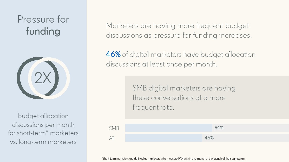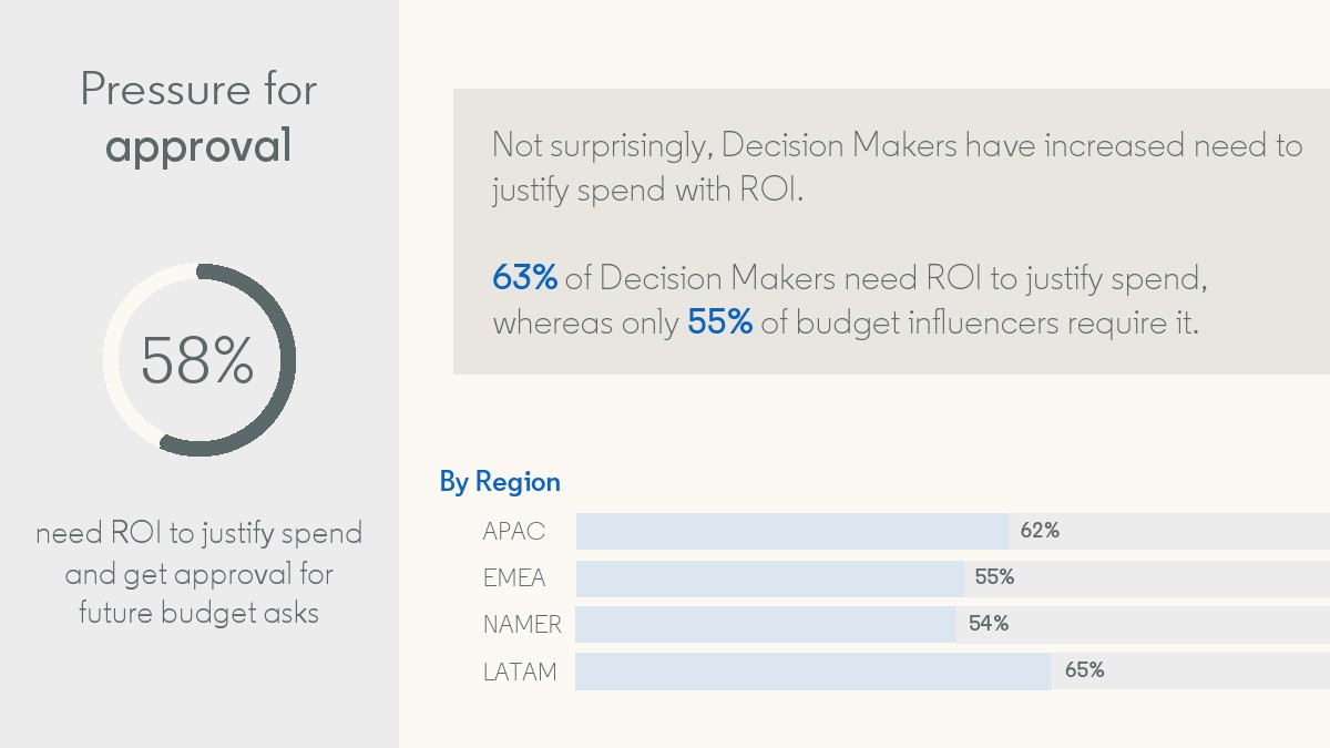 LinkedIn的调查发现,46%的受访者每月至少会讨论一次预算分配问题。另有58%的受访者需要投资回报率(ROI)来证明自己的支出是合理的。