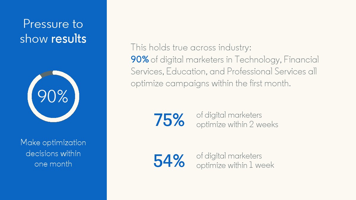 营销人员也能迅速优化广告,90%的受访者表示会在广告开始后一个月内做出优化决定,75%的受访者会在2周内做出优化决定。