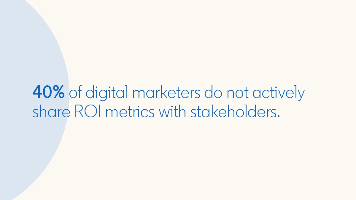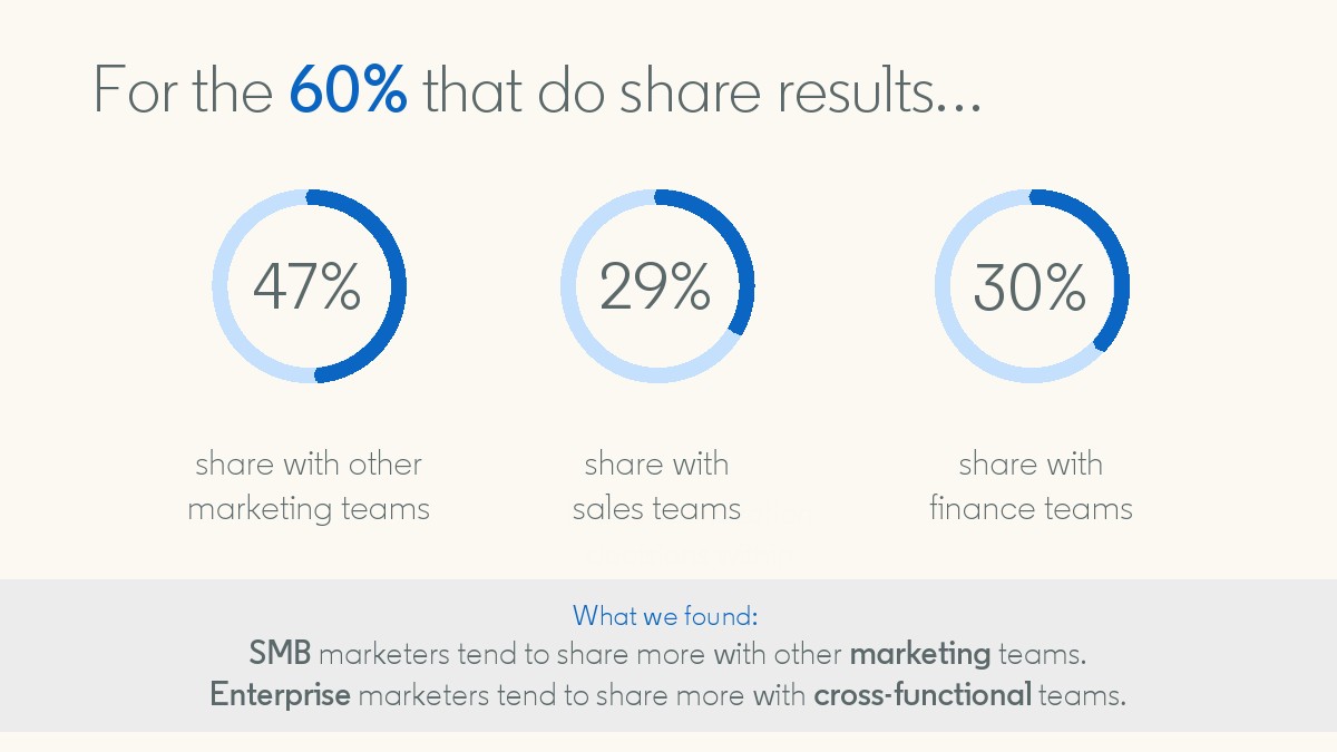 6/10的受访者会与其他利益相关者分享了他们的ROI结果。其中约47%的受访者与其他营销团队共享,其次是财务(30%)和销售(29%)团队。