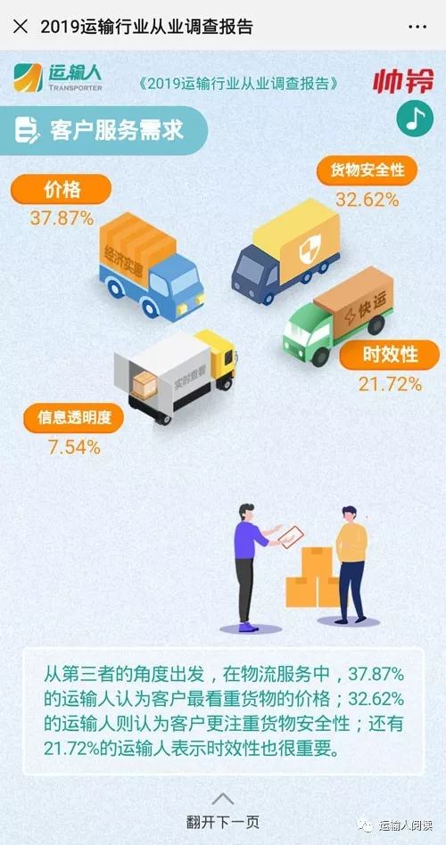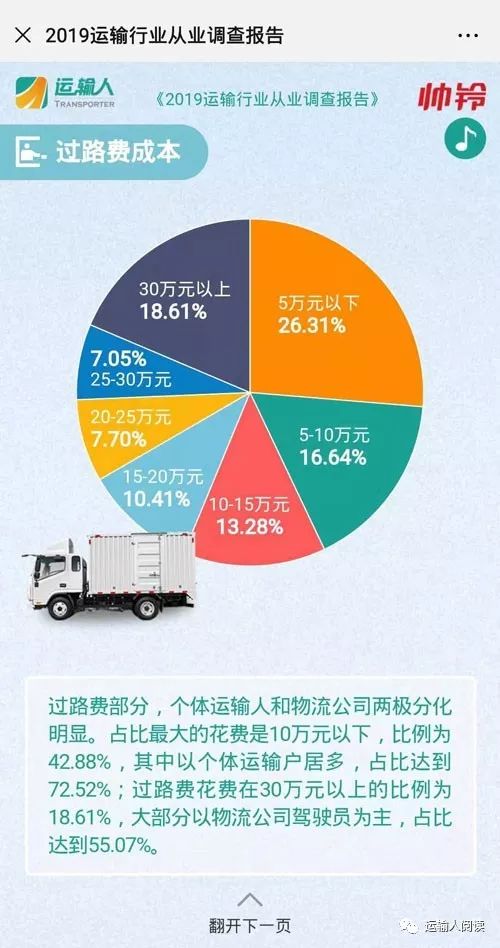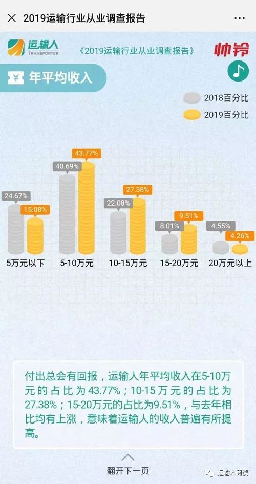 运输人:2019运输人从业现状调查 物流行业是重要的现代服务业之一,被业界称为”第三利润源”。随着国家经济的高速发展和政策的高度支持,我国物流行业正在从传统物流向现代物流迅速转型。2019年,物流行业整体市场正处于一个上升阶段。 物流行业蓬勃发展的背后,是千万运输行业从业者的汗水和付出。作为公路运输的劳动主体,运输人承担着社会上75%的物流重任。在经历创新变革的同时,市场对从业者也提出了更高的要求。 2019年,《运输人》再次启动《运输人从业现状调查》,截至目前已经收到近3000份调查结果,《运输人》记者对调查数据进行了分类汇总,于2019中国国际商用车展期间发布。 | 个体是主力行业纳新成难题 调查结果显示,当前运输行业从业者中,个体运输户依旧是行业主力,占比65.24%,与2018年调查结果相比,比例增长近9.09%;物流公司雇员和物流公司经营者则分别占比29.51%、5.25%。 其中,物流公司雇员同比下降明显,降幅达7.65%,可见,物流行业招工难现象仍然存在。 由于高危且高强度的工作特点,运输人性别比例一向是男多女少。调查数据显示,男性从业者占比为95.08%,女性从业者占比仅为4.92%,与2018年数据相比,女性比例下降了4.11%。 从运输人的年龄结构来看,30-40岁的壮年运输人占据比例过半,达到了55.90%;40-50岁的中年运输人次之,占比为27.05%;20-30岁的年轻人占比仅为14.67%,同比下降1.92%,可见运输行业在纳新方面有些吃力。 对于下一代,78.20%的运输人表示不愿意让子女从事运输行业,仅有3.85%的运输人表示支持。 | “996”工作制 付出总会有回报 从工作时长来看,运输行业里“996”工作制的人比比皆是,每天平均工作8-12个小时的运输人比例为43.03%;工作12-16个小时的比例是35.08%;甚至有12.79%的运输人每天工作16个小时以上。 根据调查显示,39.18%的运输人有过度肥胖的症状,66.07%的运输人患有腰椎疾病,67.38%的运输人有颈椎疾病,还有61.72%的运输人因为经常不定时吃饭而引发了肠胃疾病。 值得注意的是,同时患有多种职业病的比例高达20.28%,运输人在努力工作的同时也需要注重身体健康。 安全方面,遭遇过1-3次交通事故的运输人占比为51.89%,除疲劳驾驶外,驾驶盲区、恶劣天气等安全问题都需要注意;39.67%的运输人从未发生过交通事故,值得更多的运输人学习。 付出总会有回报,运输人年平均收入在5-10万元的占比为43.77%;10-15万元的占比为27.38%;15-20万元的占比为9.51%,与去年相比均有上涨,意味着运输人的收入普遍有所提高。 与此同时,运输人的贷款压力也在逐渐减少。2018年调查结果显示,20.26%的运输人每月需要偿还1万元以上的贷款,2019年,大部分运输人的贷款偿还额度主要集中在1-5000元,占比为26.50%。 社会保障方面,越来越多的运输人开始意识到社保的重要性,没有参加社保的运输人比例从去年的36.02%降至今年的7.62%。 | 运输也有南北差异 就地域而言,作为运输大省的河南、河北、山东等地依旧占据了极大份量,运输人数量占全国总数的38.03%。其中,来自河北的运输人数量最多,比例达到15.49%;河南运输人的比例为12.05%;山东运输人比例则为10.49%。 综合来看,零担货运是这三个省份中最普遍的运输方式,比例达到42.89%;煤炭运输在河北和山东两地也极为常见,比例为12.93%。 与此同时,广东省的运输人分布也相对较多,占总数的9.34%。相比北方的运输大省来说,广东则主要以快递快运为主,占比达到46.49%,其中,有79.25%的运输人是快递、快运等运输企业的雇员。 按照运营路线来看,南方区域在电子商务发展的带动下,主要是从江苏、浙江地区出发,分散前往以广东为中心的华南地区和以云南为主的西南地区;北方区域的运力则主要集中在京津冀地区,将货物运向全国各地,其中,前往山东的占比最大,达到13.39%,还有7.87%是运往东北地区。 | 运输人多样化需求如何满足? 根据调查显示,受访者中有83.21%的运输人属于重卡用户,其中,67.93%的运输车辆为牵引车,25.57%为载货车。 从购车因素上来说,车辆性价比、品牌知名度、市场口碑、售后保障、运营经济性和驾乘舒适性等都是运输人关注的重点。数据显示,有30.08%的运输人会将这六项因素都列在购车的考察范围内。 与此同时,运输人对车辆的改进也提出了更高的要求。特别是在油耗水平方面,随着近几年油价的持续走高,82.30%的运输人希望车企能在节油方面大力升级。 从运输人现有车辆满足的排放标准来看,有2.47%的运输人已经切换到国六车型,在一定程度上刺激企业加快升级国六车型的步伐;41.64%的运输人认为,国六时代的到来将促进运输车辆向高端化、标准化发展,有利于行业集约化。 另外,85.16%的运输人对当前流行的智能化发展表示认可,他们希望通过智能设备的升级,有效增加运输人的驾驶安全性。 | 高成本运营燃料费 从运营成本来看,除了购买车辆这一项固定成本外,运输路上还有很多必要的花费,如过路费、购买车辆保险、燃料费、相关手续费、车辆维修保养费等。 具体细分后,车辆燃料费占据了最大比重45.82%,过路费次之,占比为22.87%。 据调查,运输人每年每辆车需要的燃料费用在10-20万元的占比为24.34%,这些车每月大约会跑5000-10000公里; 燃料费在10万元以下的占比为21.48%,车辆每月运营里程大多在5000公里以下;需要20-30万元燃料费的比例为19.67%,车辆每月运营里程在10000-20000公里之间。 过路费部分,个体运输人
