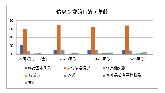 《金融素养报告》发现,在借款频率上,有接近五分之一的现金贷借款人(18%)在过去的 1 年中借现金贷的次数大于5次。因此,即使职业青年所借现金贷的频率平均而言没有预想的高,但是相当一部分人比较频繁,容易导致过度负债。从借款目的来看,相当大部分借款人(66%)借现金贷主要是为了“应付紧急情况”,也有相当一部分人(14%)是为了“维持基本生活”,但是也有不小比例(十分之一)的青年人是为了“还其它欠款”,即俗称的“以债养债”。