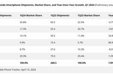 IDC:2024年Q1全球智能手机出货量同比增长7.8%至2.894亿部